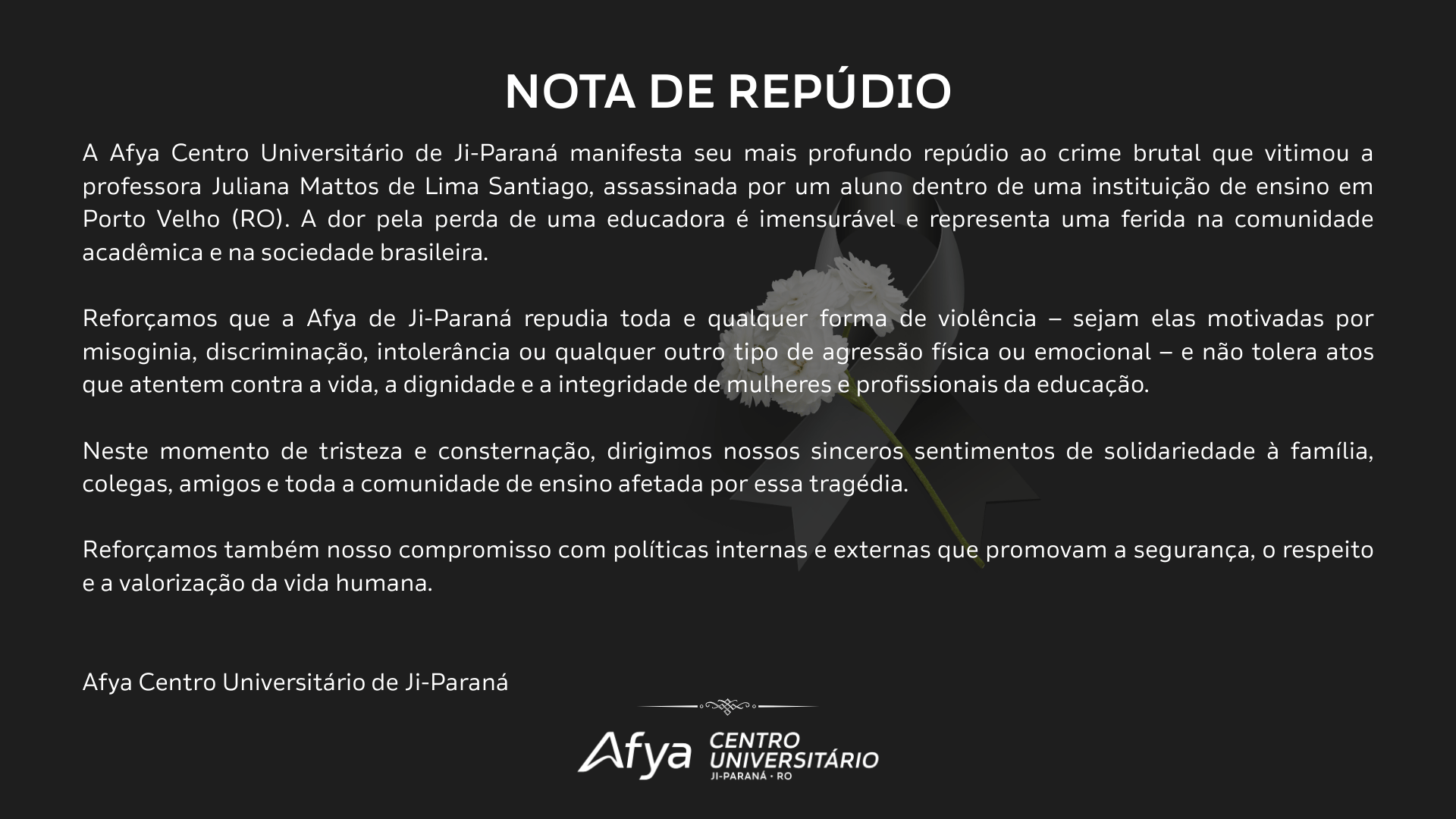 Reforçamos que a Afya de Ji-Paraná repudia toda e qualquer forma de violência — sejam elas motivadas por misoginia, discriminação, intolerância ou qualquer outro tipo de agressão física ou emocional — e não tolera atos que atentem contra a vida, a dignidade e a integridade de mulheres e profissionais da educação.