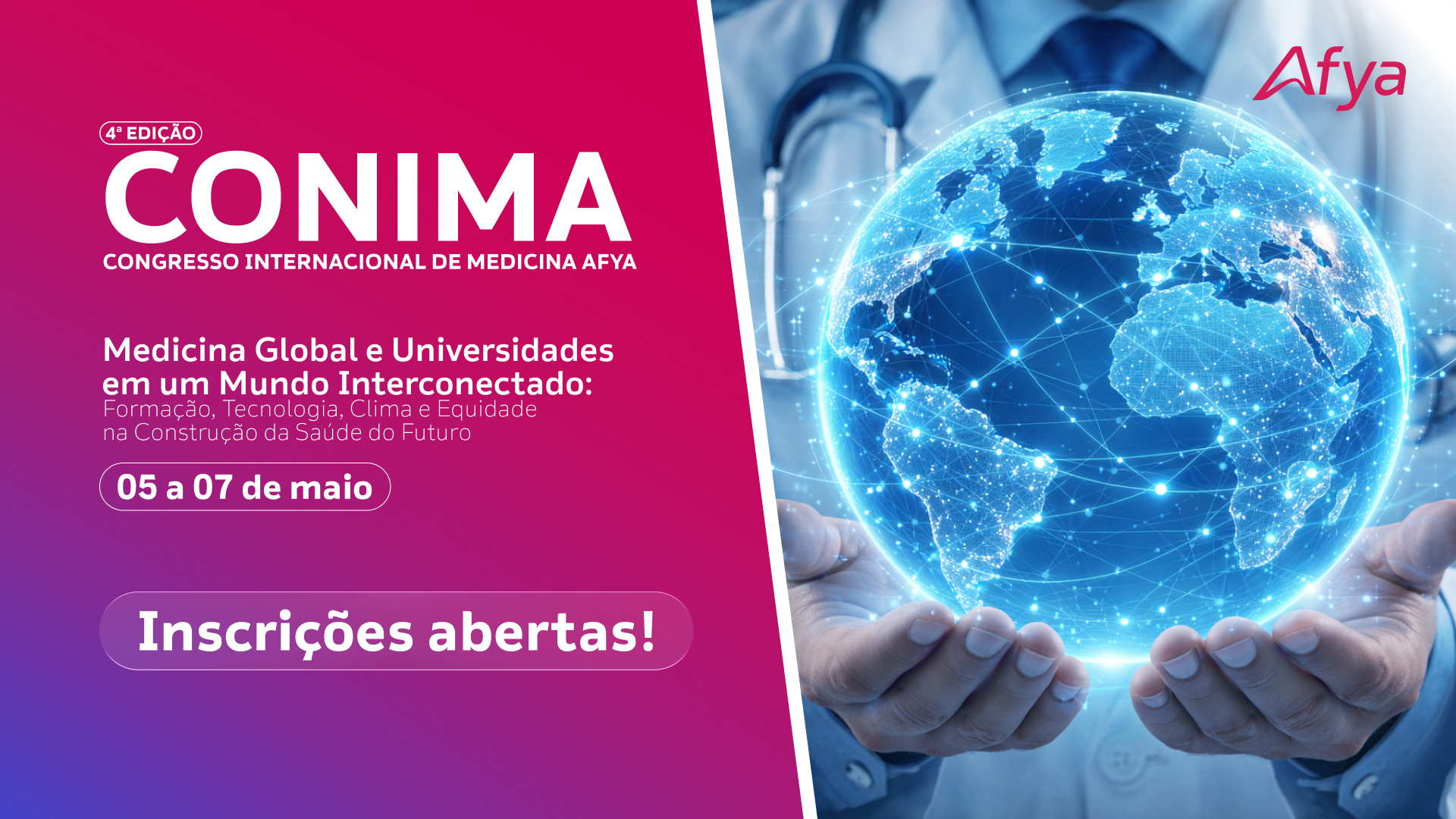 O Congresso Internacional de Medicina Afya acontecerá nos dias 05, 06 e 07 de maio de 2026, com transmissão pelo YouTube.